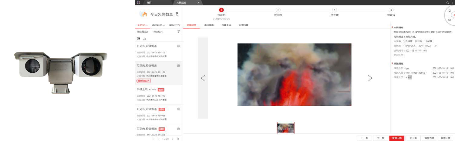 可见光高清摄像机配合红外热像仪使用还可以帮助工作人员及时有效地识别火源。同时,可在后台运行雾化穿透算法,有效减轻雾霾天气对可见光成像的影响,最大化工作人员的可见光图像。